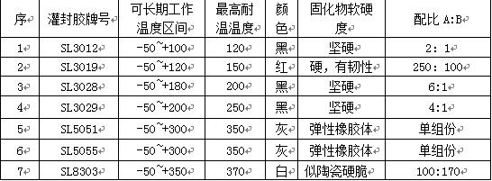 根據(jù)需要加熱的功率不同對(duì)灌封膠的要求也不一樣,一般來(lái)說(shuō)按溫度等級(jí)劃分的比較多。那么膠水的密封性的好壞,直接影響到電熱管的絕緣及使用壽命。下表全是世林的灌封膠可供參考: